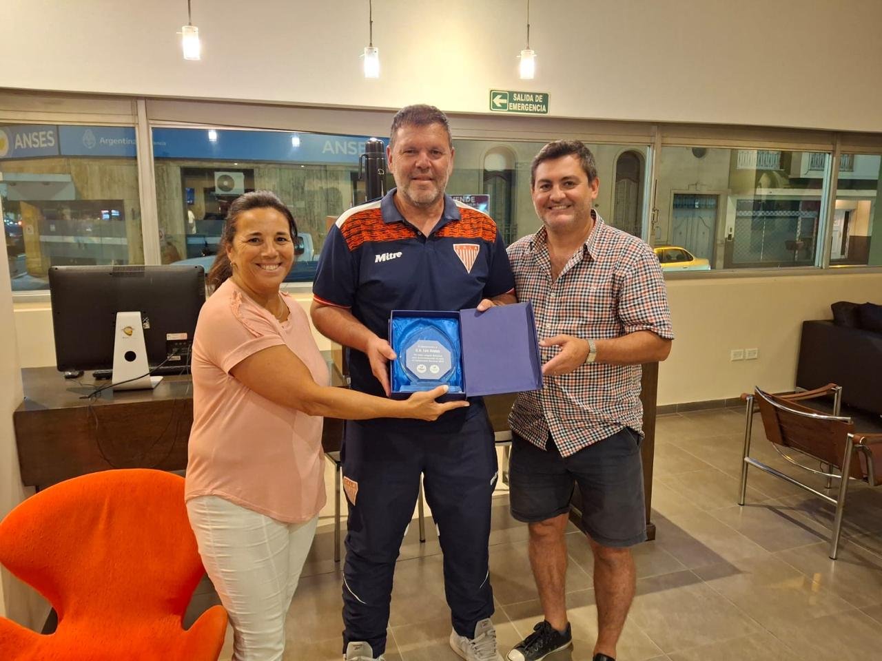 La subsecretaria de Deportes, Soledad Vivio, y Juan Best, integrante del equipo de Turismo, entregaron una placa recordatoria al director deportivo de Los Andes, Claudio Balsano, como agradecimiento por haber elegido Balcarce.