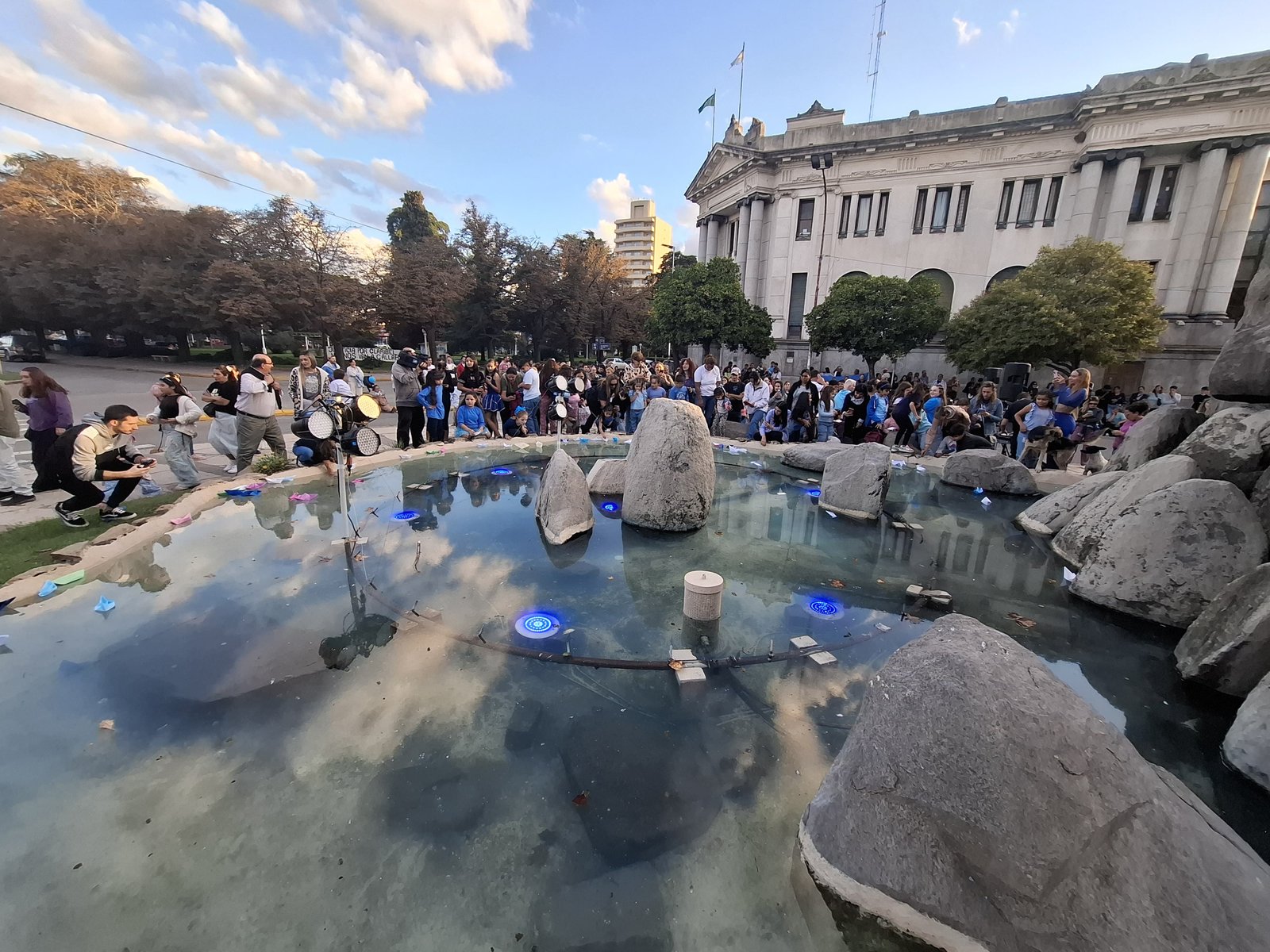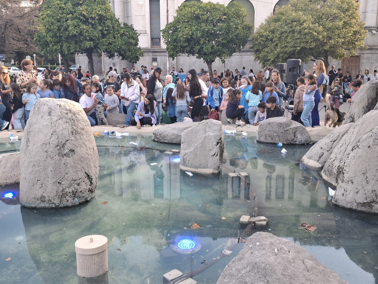 Uno de los momentos más significativos fue la actividad simbólica en la que niños y adultos confeccionaron barcos de papel, plasmando en ellos sus sueños y deseos. Luego, los dejaron flotar sobre el agua de la fuente, como un gesto de esperanza y compromiso.
