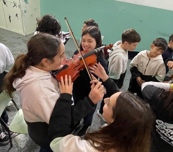 Durante la mañana, alumnos de 4º, 5º y 6º año participaron en distintas actividades divididas en grupos, donde pudieron escuchar canciones del repertorio orquestal y dialogar sobre la familia de instrumentos de cuerda frotada, sus cualidades sonoras y el rol que cumple cada instrumento dentro de la orquesta. Además, los estudiantes disfrutaron de “mini clases” prácticas que les permitieron probar personalmente cada instrumento.
