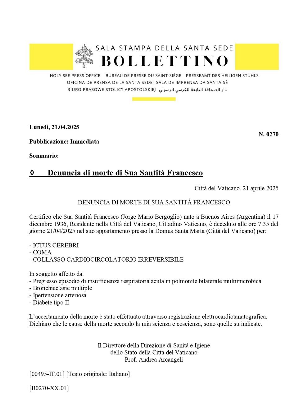 “Certifico que Su Santidad Francisco (Jorge Mario Bergoglio) nacido en Buenos Aires (Argentina) el 17 de diciembre de 1936, residente en la Ciudad del Vaticano, Ciudadano del Vaticano, falleció a las 7.35 horas del día 21/04/2025 en su piso de la Domus Santa Marta (Ciudad del Vaticano) de: un derrame cerebral, coma y colapso cardiovascular irreversible”, dice el comunicado oficial.