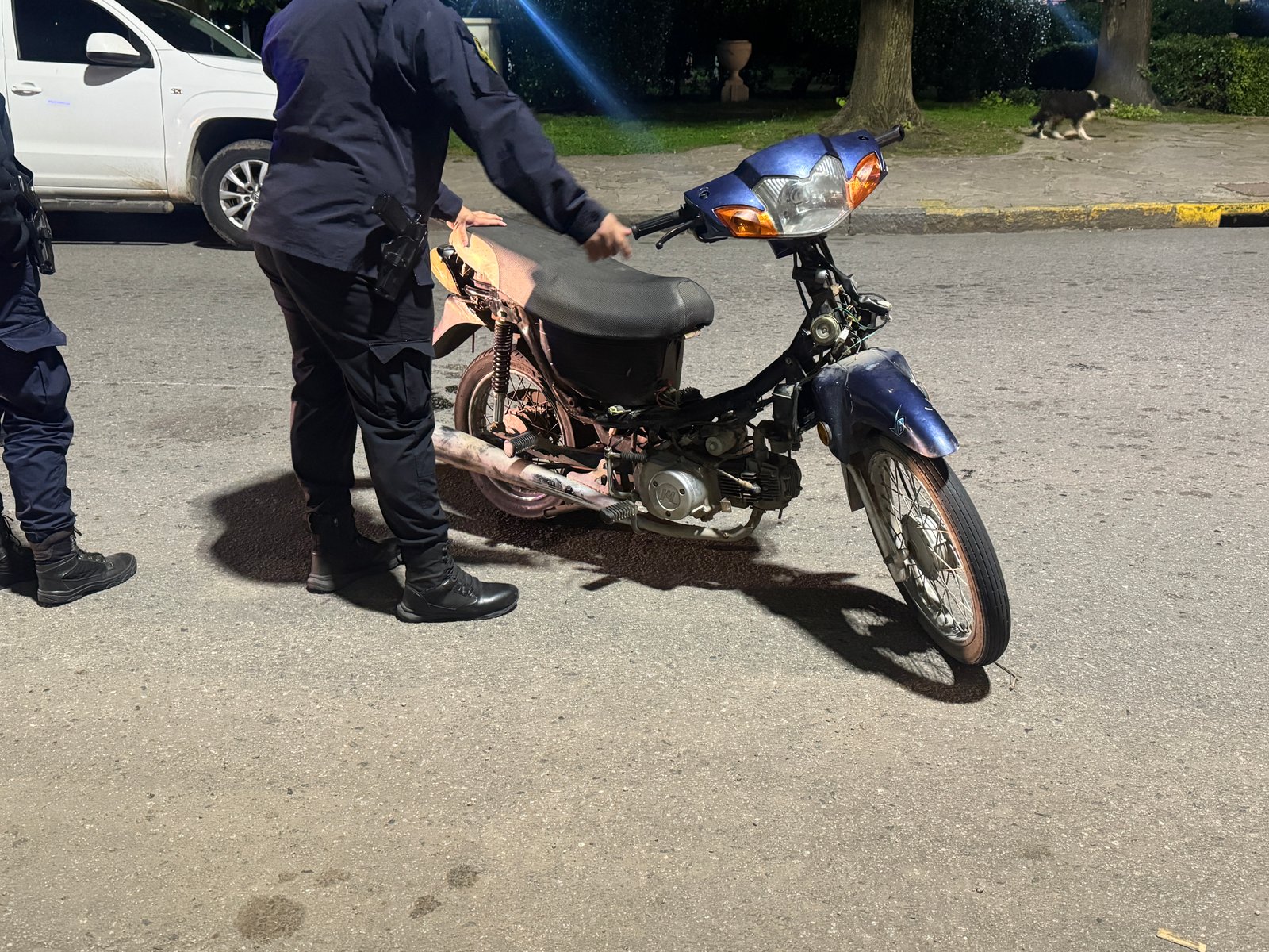 Como consecuencia del siniestro, una de sus piernas quedó atrapada entre partes de la moto, por lo que una dotación de Bomberos Voluntarios debió intervenir para realizar tareas de corte y liberación.