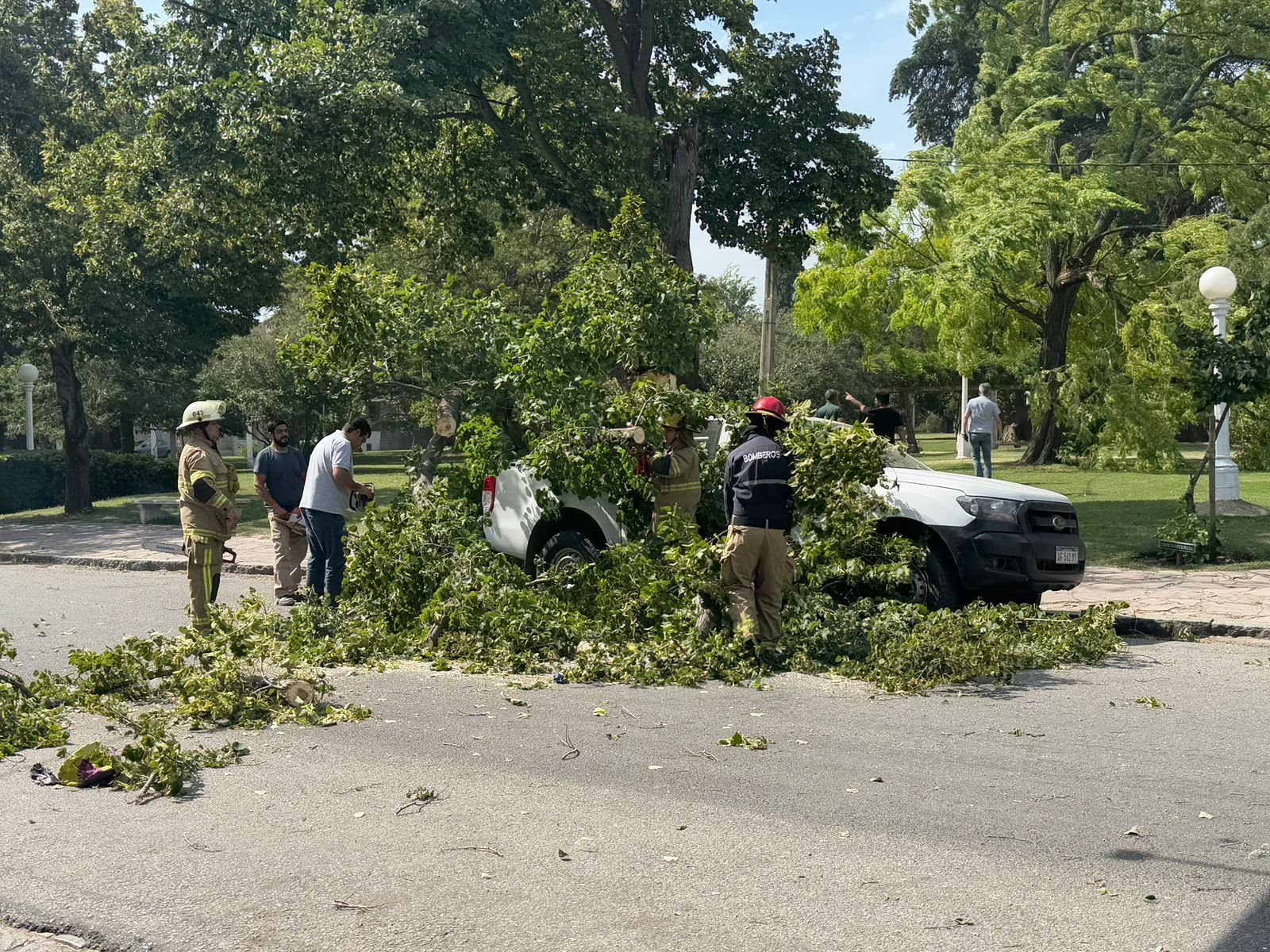Bomberos Voluntarios, así como también personal de la Municipalidad, cortaron la planta con motosierras, para poder despejar la vía que se encontraba obstaculizada por el hecho precedente.